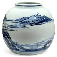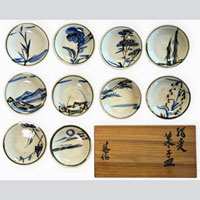 | 近藤 悠三(こんどう ゆうぞう) 1902年(明治35年)京都市清水寺下に生れる。本名は近藤雄三 1914年(大正3年・12歳)から1917年(大正10年・19歳)まで京都市立陶磁器試験所付属轆轤科にて修業。この間に、その技量と人柄を認められて河井寛次郎先生、濱田庄司先生の知遇を得る。 1921年(大正10年・19歳)河井・濱田両先生の薦めで富本憲吉先生の助手となる。 1924年(大正13年・22歳)富本憲吉先生の許しを得て、独立する。 1927年(昭和2年・25歳)大山巌閣下の勧めにより、東京銀座「美術園」にて始めての個展を開催。 1969年(昭和44年・67歳)京都市立芸術大学初代学長に就任する。 1970年(昭和45年・68歳)紫綬褒章受賞。 1977年(昭和52年・75歳)染付の技法で国指定重要無形文化財技術保持者(人間国宝)に認定。 1985 年(昭和60年・83歳)胃がんのため逝去。 |