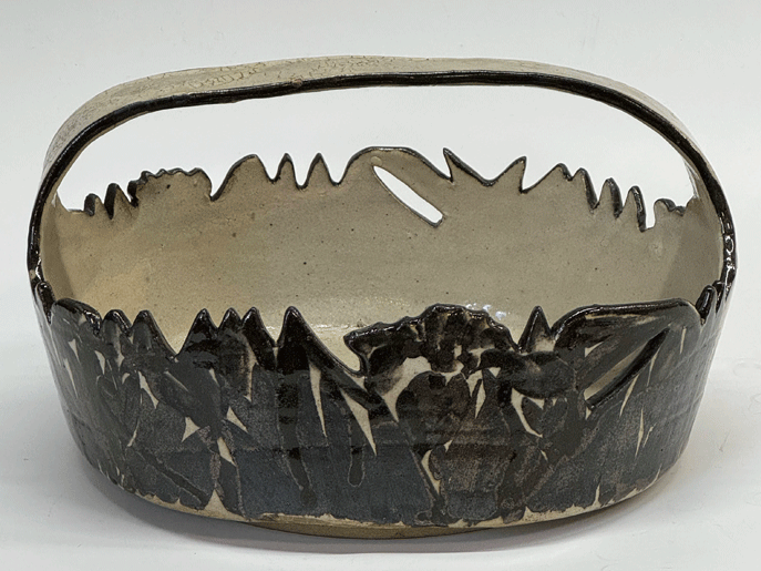 幅27.0cm*23.015.0cm 高さcm 花菖蒲(あやめ)をぐるりと一周に描き、透かしを切り抜いています。 安定するように配慮されて、底は二重高台にし「乾山」の銘を力強く記しています。 尾形乾山の絶頂期の名品です。