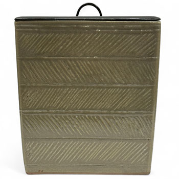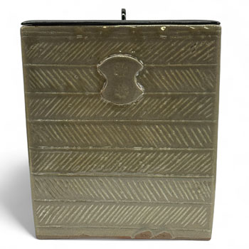 高さ17.6cm 口径16.2cm*16.2cm ¥275,000 茶道裏千家に伝わる千利休在判の木地釣瓶水指を 虫明焼で制作した作品。 清々しい風合いの御道具です。