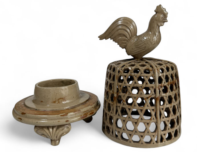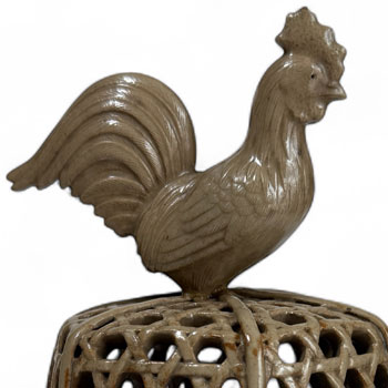 高さ19.7cm 底径11.4cm ¥375,000 閑谷焼は江戸時代・寛文年間(1661年~1673年)に 備前岡山藩主・池田光政の時代に京都から仁清など優れた陶工を招聘して、主として公卿に対する献上の目的で制作された稀少な焼物です。 この鳥は愛玩用として飼育された唐丸(とうまる)と、唐丸籠を題材に制作しています。 唐丸の細やかな毛彫と唐丸籠の籠目は超絶技巧の繊細な技物です。