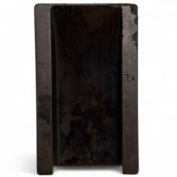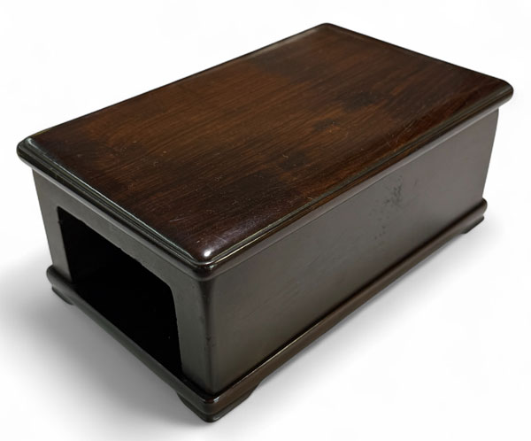 長方形をしており、左右に高い脚を設け手前が空処と成っているのが特徴です。これは背面に四本の指を挿し入れて親指で硯を押さえて持ち安全に移動する用が工夫されています。