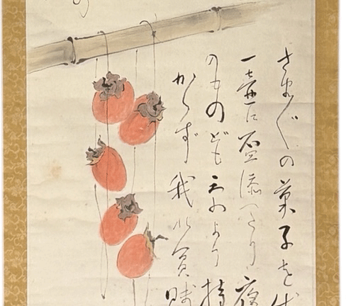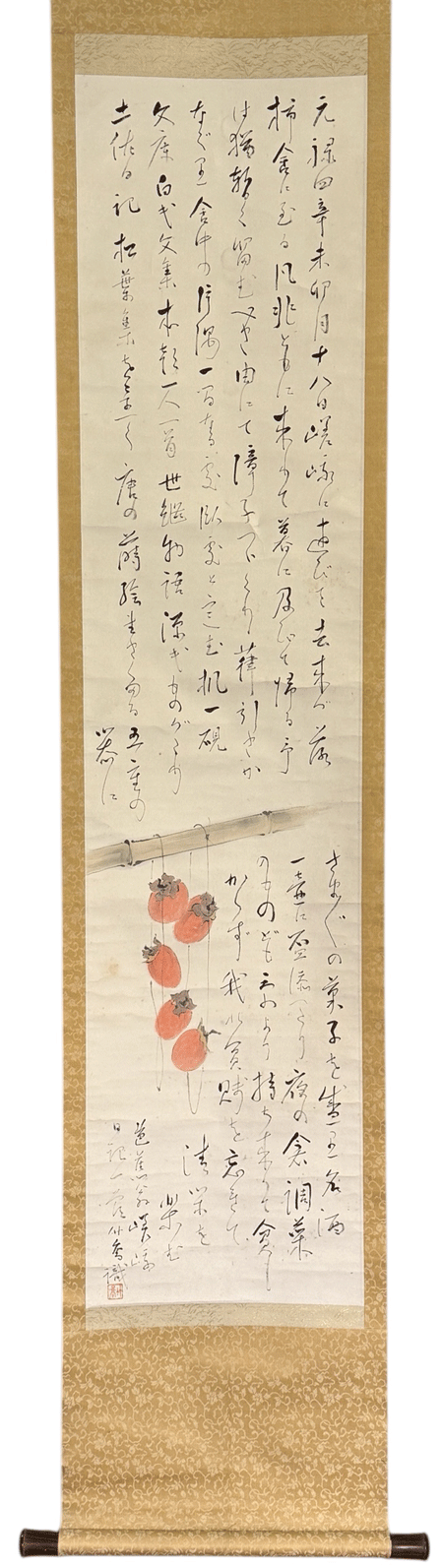 掛軸の大きさ:たて192.5cm 横33.6cm 晩年に松尾芭蕉「奥の細道」の心中を絵画に表現して世に問うた小野竹喬は蕉風の世界に心を寄せていました。 この作品は芭蕉が弟子の去来の落柿舎(らくししゃ)に遊んだ折の嵯峨日記の一説を識しています。 「落柿舎」の名の元になった干柿を描き添えています。 元禄四辛未(元禄四かのとひつじ)西暦1691年 卯月(うずき:旧暦の四月現在では四月下旬から六月上旬)