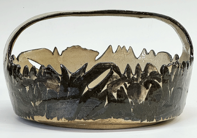 幅27.0cm*23.015.0cm 高さcm 花菖蒲(あやめ)をぐるりと一周に描き、透かしを切り抜いています。 安定するように配慮されて、底は二重高台にし「乾山」の銘を力強く記しています。 尾形乾山の絶頂期の名品です。