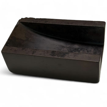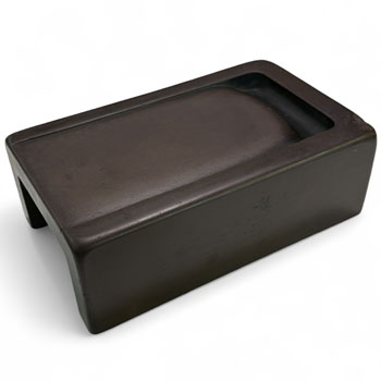 長方形をしており、左右に高い脚を設け手前が空処と成っているのが特徴です。これは背面に四本の指を挿し入れて親指で硯を押さえて持ち安全に移動する用が工夫されています。