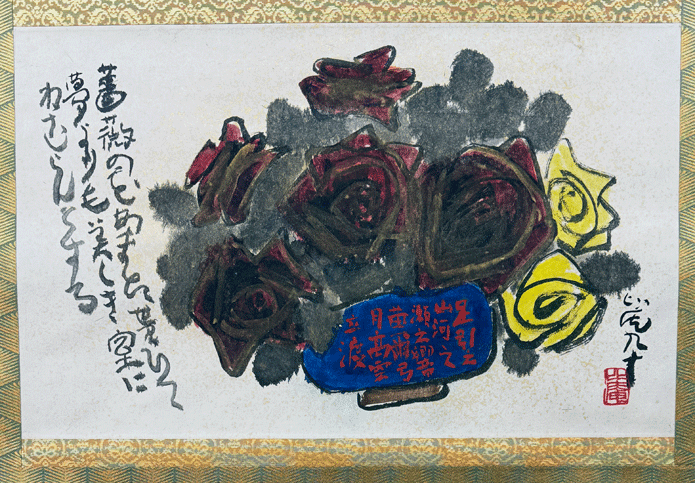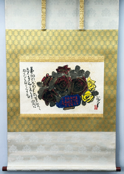 掛け軸の大きさ:横66.0cm たて130.0cm ¥175,000 「薔薇の花 あまた貰ひて 夢よりも 美しき室に ねむらんとする 比庵九十」 黄色の薔薇、紅蓮(ぐれん)の薔薇が青い花瓶に活けられています。 金砂子(きんすなご)と云う金粉を和紙の裏から打つ特別の紙を使用した九十歳の力作です。