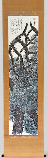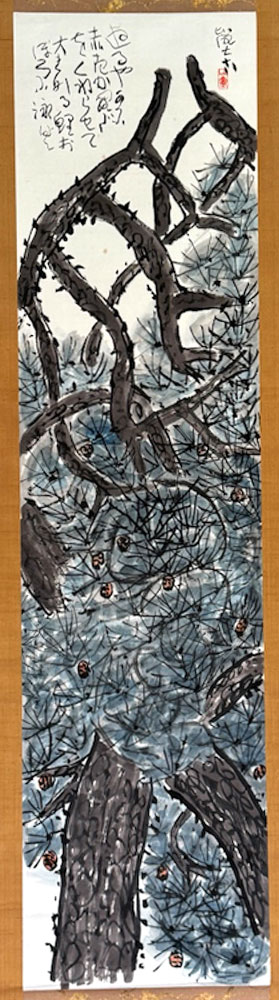 掛軸の大きさ 幅46.1cm たて201.0 cm ¥87,000 ゆるやかに 赤きからだを くねらせて 大きなる鯉 おぼろに泳ぐ 比庵七十八 比庵先生は笠岡の古城山公園を散歩するのが好きでした。 その中央には池が在り、大きな鯉が悠然と泳いでいます。