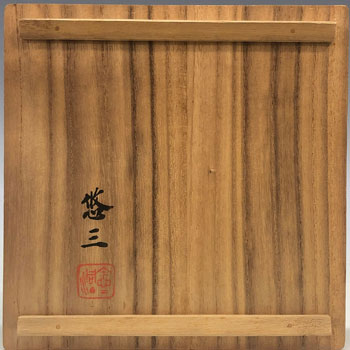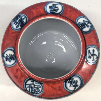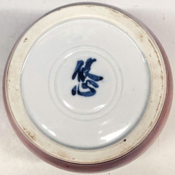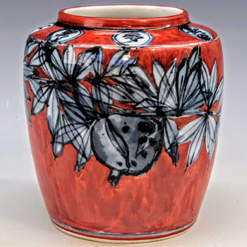 高さ18.2cm 胴径17.0cm ¥370,000 人間国宝・近藤悠三先生が生涯を通じて拘り得意とした柘榴染付の作品。 一度、染付作品として焼成し窯出した後に、空間の白磁部分を赤絵で細やかに塗りつぶしています。 近藤悠三作品の傑作の一つです。